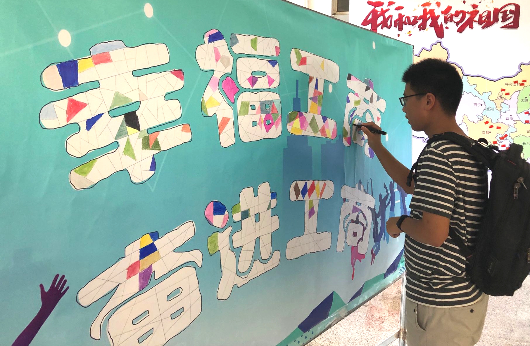上午8时,新生陆续前来报到。有序完成报到后,新生在现场志愿者的引导下,在“2019级新生签名墙”上签下自己的名字,并举牌“南财,我来了”拍照留念,以此纪念入学第一天,新生们眼睛里都充满了对未来的期许。签名后,新生来到新版标准“中国地图”前,将写有自己对祖国70周年生日的祝福写在国旗小贴纸上,并贴在家乡对应的位置,以此向新中国成立70周年送上祝福,表达了新生们对祖国美好未来的期望。随后,新生在“幸福工商,奋进工商”涂色牌处用彩笔给这八个字进行涂色,大家你一笔我一笔,为涂色牌增添色彩,绘出五彩斑斓的“幸福工商,奋进工商”,涂满颜色的涂色牌也象征着新生的到来为学院注入了新鲜血液,增添了新的色彩,工商人队伍的壮大昭示着工商院将迎来一个更加辉煌的未来。