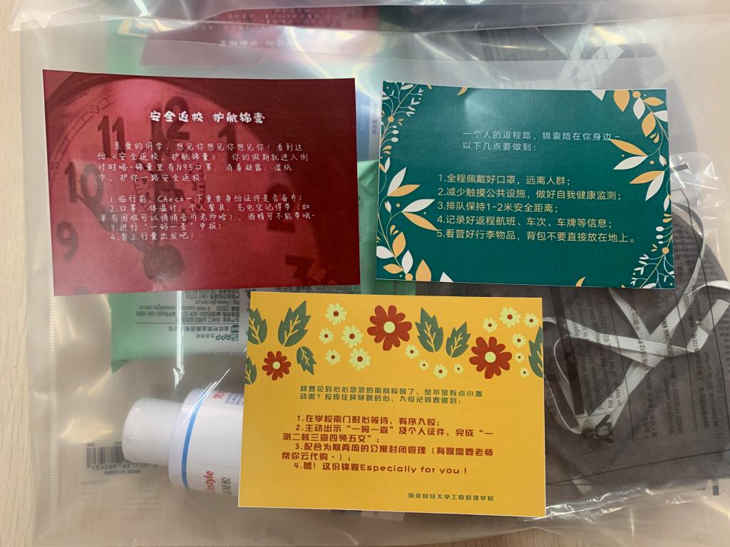 小小锦囊,寄托无限关爱;殷殷深情,凝聚磅礴力量。红、绿、黄三张“安全返校 护航锦囊”分别提醒同学们在出行前、返校途中以及入校前所有需要注意的事项。随同三张锦囊一同寄到同学手中的,还有N95口罩、消毒凝露以及消毒湿纸巾等防护物品。