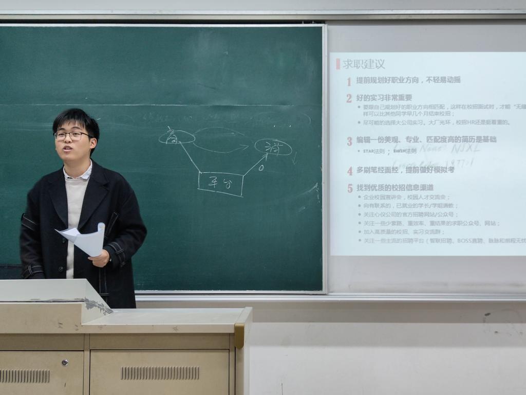 于博文楼203教室开展了“‘职’引人生”就业经验分享交流会,活动邀请了已成功签约中建八局总承包建设有限公司的陈相国、南京市江宁区人力资源和社会保障局的周颖和中海油能源发展股份有限公司的张婧盈三名2023届毕业生作为嘉宾分享就业经验,与同学们进行答疑交流。日本AV女优