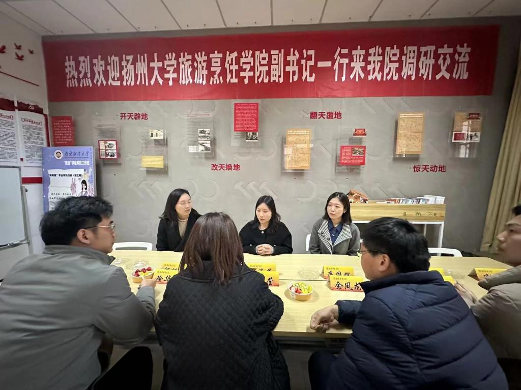 对周莹副书记一行的到访表示热烈欢迎,并从师资力量、学科建设、人才培养、学术研究等方面介绍了学院的基本情况。廉同辉主任详细介绍了学院旅游管理专业本科人才培养和专业建设情况,并与调研团交流学科建设方面的心得体会;分团委书记张鹏岩从引领青年、凝聚青年、服务青年、发展青年四个方面介绍了学院特色活动的开展情况;2021级辅导员、心理辅导员赵菲老师介绍了学生工作品牌建设情况和心理育人成效;学工办主任邱祥霞展示了学院在就业管理、就业服务等方面的特色做法和成绩,双方对就业工作的成功经验和具体做法展开了深入交流。